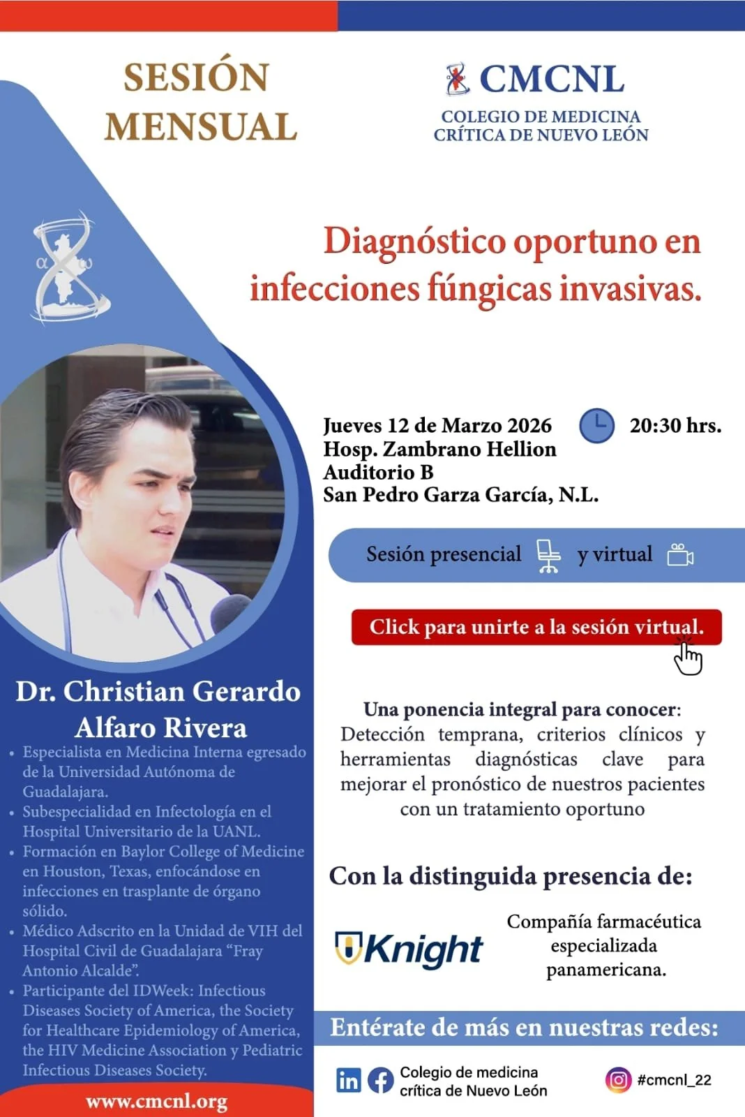 Acompáñanos a esta conferencia con la visita del Dr. Christian Alfaro, actualmente médico en el hospital civil de Guadalajara. Quien no comparte una actulización en el diagnóstico, manejo y seguimiento de infecciones fúngicas en UCIA.